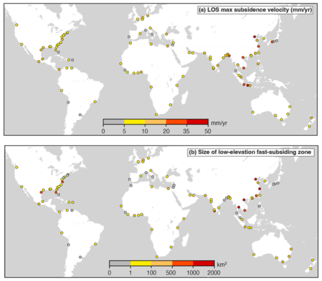 在研究调查的全球99个沿海城市在2015年至2020年中,大部分城市有部分区域出现沉降,每年下降速度平均为2毫米。有33个城市的部分地区每年下沉超过10毫米,这些城市分布在北美、欧洲、非洲和澳大利亚;而南亚、东南亚和东亚下沉速度更快,每年超过20毫米。