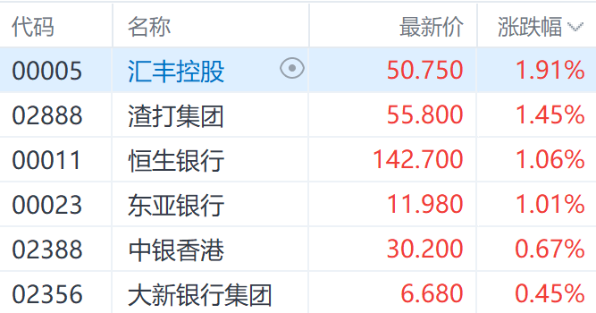 在银行板块中,以汇丰控股(00005.HK)、渣打集团(02888.HK)、恒生银行(00011.HK)为代表的港股股逐步走强,其主要受到美联储加息预期提振。