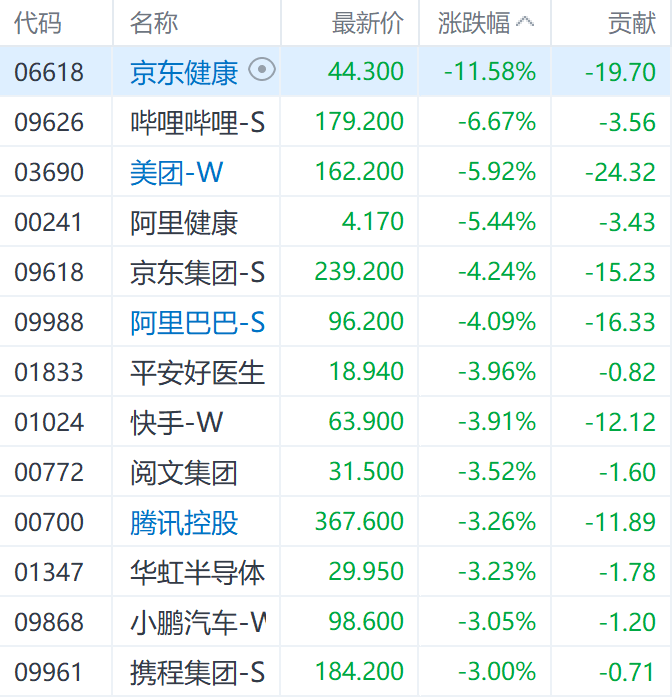 其中科技指数表现更弱,多数个股下跌,其中京东健康(06618.HK)、哔哩哔哩-SW(09626.HK)、美团(02690.HK)、京东集团-SW(09618.HK)等成分股大幅下挫,其分别下跌11.58%、6.67%、5.92%、4.24%。