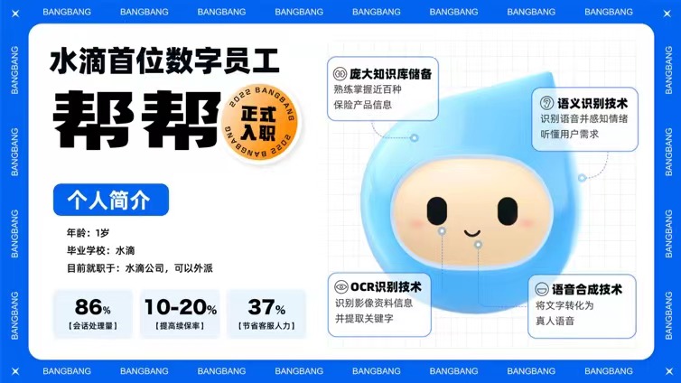 数字员工“帮帮”的应用大幅提高了水滴保的服务速度,降低成本并释放员工能力。数据显示,“帮帮”的会话处理量高达86%。这也意味着,水滴保接待的每100个来访客户中,就有86位是由“帮帮”协助服务的,意图识别准确率为97%。通过“帮帮”的服务协助,有效提高保险客户续保率,节省了37%的客服人力。