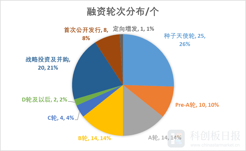 从投资轮次来看,本周投资大多集中于早期,其中种子、天使轮融资事件数目最多,发生25起,占比约为26%;战略投资及并购事件数目位列第二,发生20起,占比约21%;A轮、B轮融资事件数目位列第三,各发生14起,占比约14%。