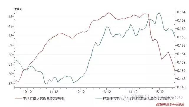 人民币兑美元汇率(红色,右轴),中国住宅平均价格(以克黄金/平米为单位)