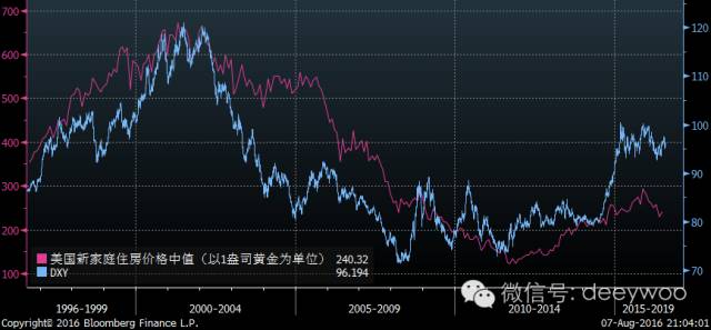 美国新家庭住房价格中值(以1盎司黄金为单位,粉红色),美元指数(蓝色) 数据来源:彭博金融数据终端