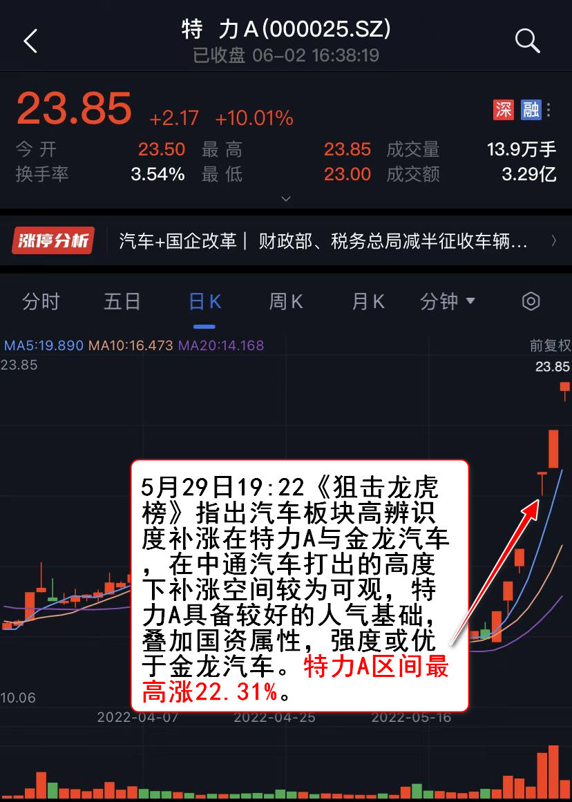 5月29日19:22《狙击龙虎榜》发布文章《 短线连板高度打开 下周关注补涨为主 》指出汽车板块高辨识度补涨在特力A与金龙汽车,在中通汽车打出的高度下补涨空间较为可观,特力A具备较好的人气基础,叠加国资属性,强度或优于金龙汽车。特力A区间最高涨22.31%。