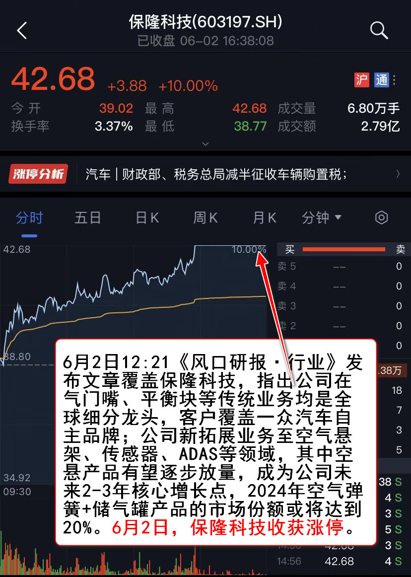6月2日12:21《风口研报·行业》 发布文章 覆盖保隆科技,指出公司在气门嘴、平衡块等传统业务均是全球细分龙头,客户覆盖一众汽车自主品牌;公司新拓展业务至空气悬架、传感器、ADAS等领域,其中空悬产品有望逐步放量,成为公司未来2-3年核心增长点,2024年空气弹簧+储气罐产品的市场份额或将达到20%。6月2日,保隆科技收获涨停。