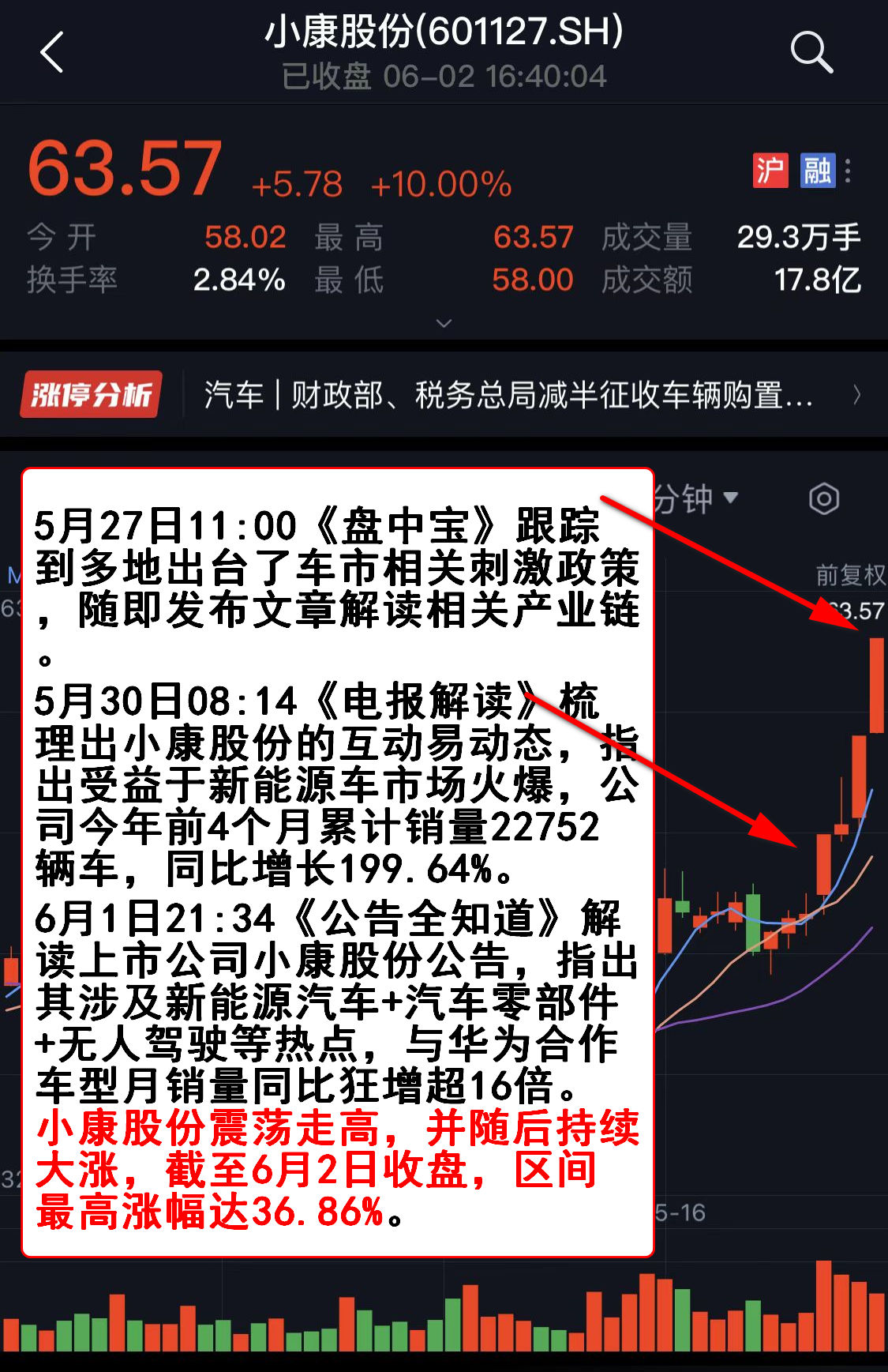 6月1日21:34《公告全知道》 解读上市公司 小康股份公告,指出其涉及新能源汽车+汽车零部件+无人驾驶等热点,与华为合作车型月销量同比狂增超16倍。