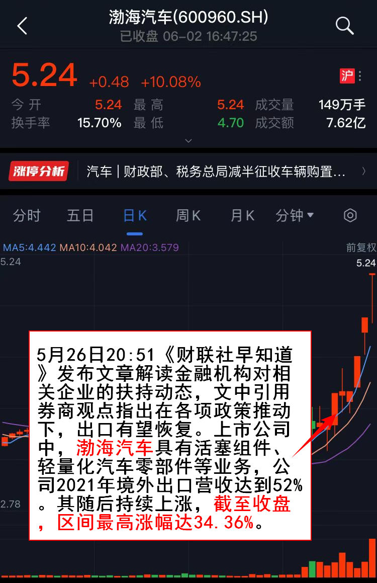 5月26日20:51 《财联社早知道》 发布文章 解读金融机构对相关企业的扶持动态,文中引用券商观点指出在各项政策推动下,出口有望恢复。上市公司中,渤海汽车具有活塞组件、轻量化汽车零部件等业务,公司2021年境外出口营收达到52%。其随后持续上涨,截至收盘,区间最高涨幅达34.36%。