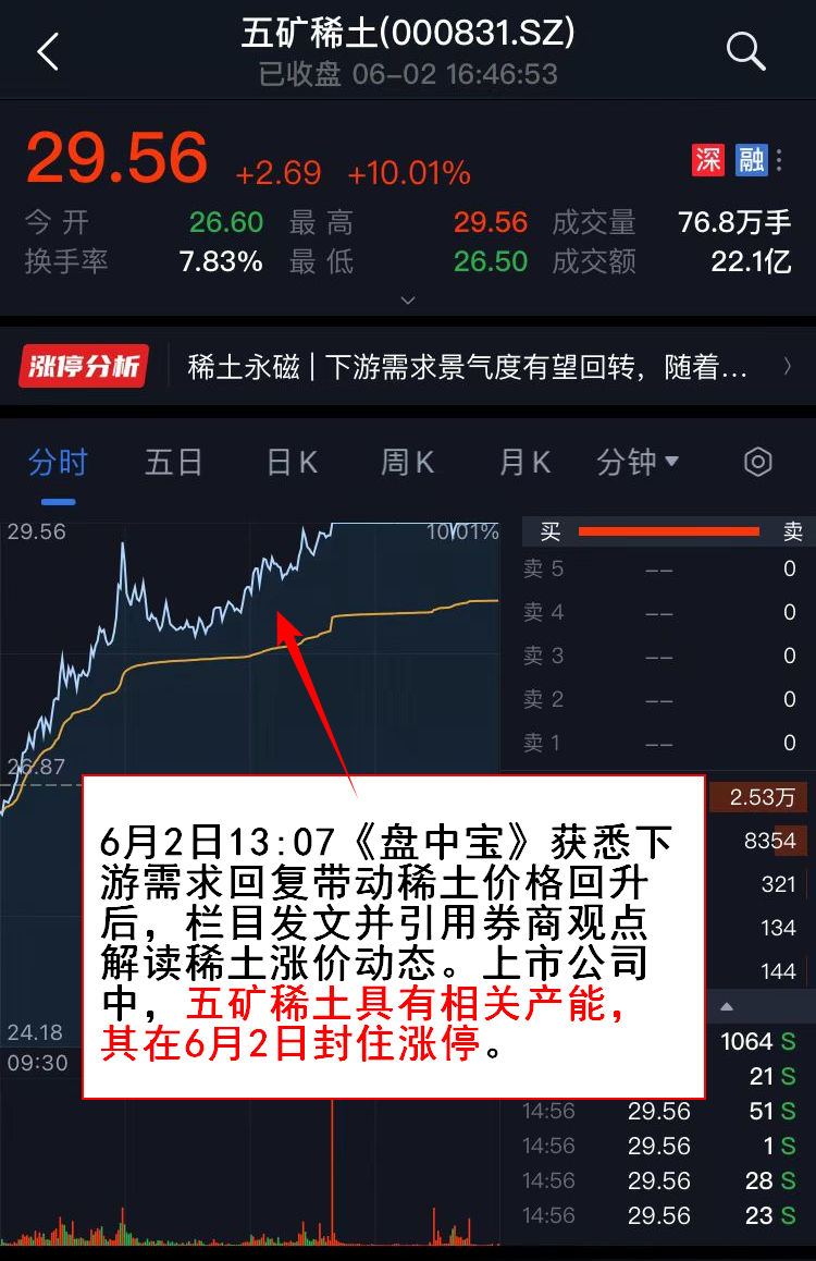 6月2日13:07《盘中宝》获悉下游需求回复带动稀土价格回升后, 栏目发文并引用券商观点 解读稀土涨价动态。文章指出,短期来看出口增加+补库存压力较大,稀土价格有望持续高位。上市公司中,五矿稀土具有相关产能,其在6月2日封住涨停。