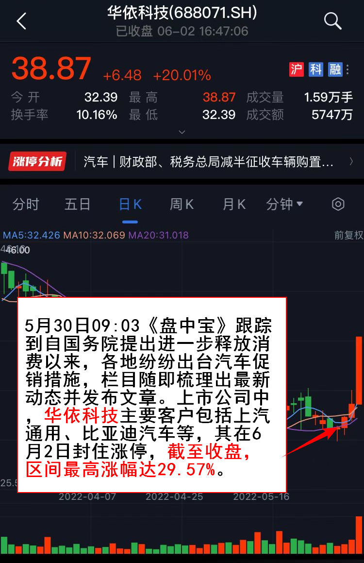 5月30日09:03《盘中宝》跟踪到自国务院提出进一步释放消费以来,各地纷纷出台汽车促销措施,栏目随即梳理出最新动态并发布文章《 置换纯电动车补贴每辆1万元,这一地区促消费“放大招” 》。上市公司中,华依科技主要客户包括上汽通用、比亚迪汽车等,其在6月2日封住涨停,截至收盘,区间最高涨幅达29.57%。