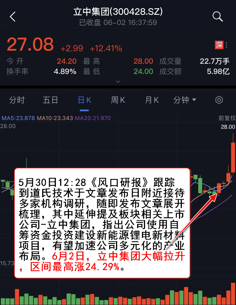 5月30日12:28《风口研报》跟踪到道氏技术于文章发布日附近接待多家机构调研,随即发布文章《 材料小龙头布局“碳材料+锂电+陶瓷”三大板块 》展开梳理,其中延伸提及板块相关上市公司-立中集团,指出公司使用自筹资金投资建设新能源锂电新材料项目,有望加速公司多元化的产业布局。6月2日,立中集团大幅拉升,区间最高涨24.29%。
