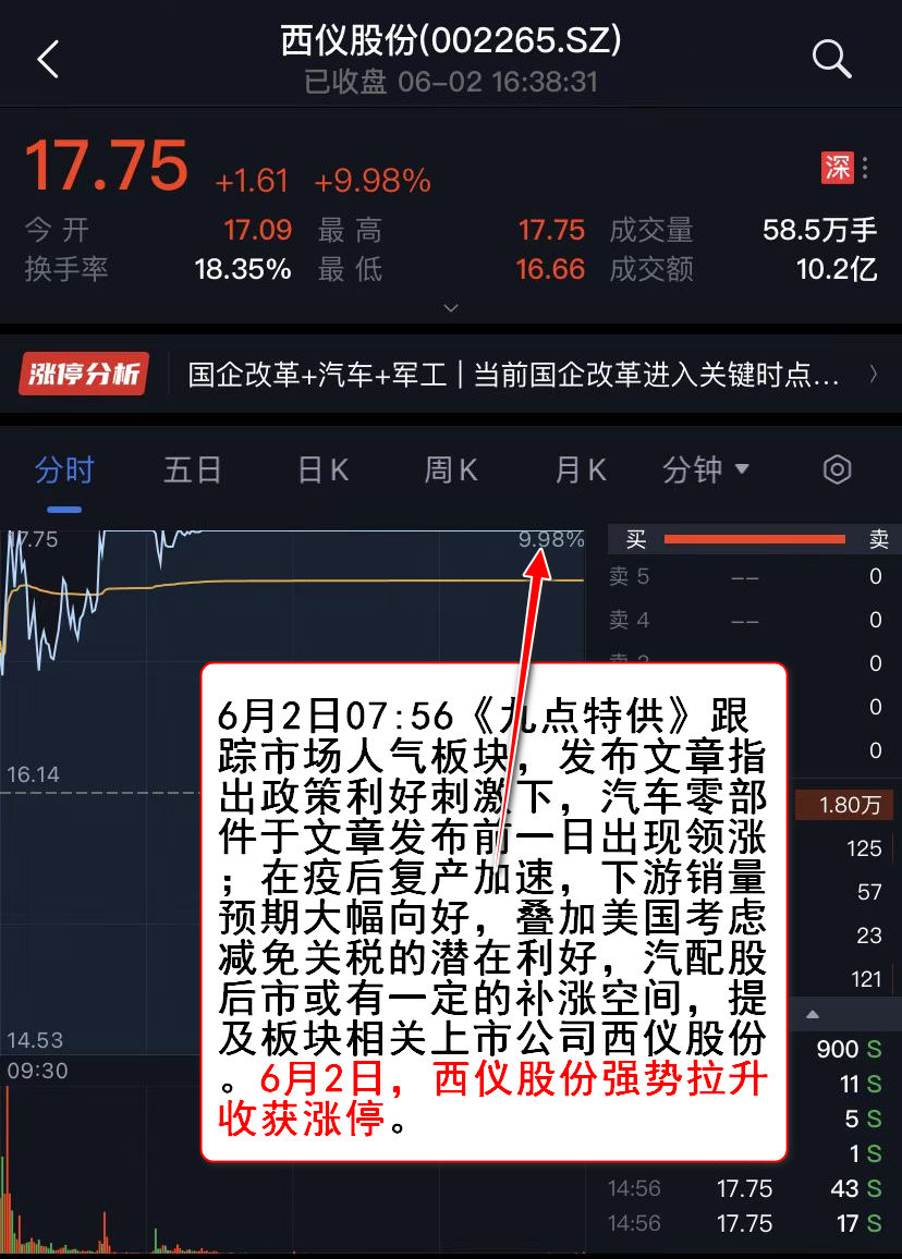 6月2日07:56《九点特供》跟踪市场人气板块, 发布文章 指出政策利好刺激下,汽车零部件于文章发布前一日出现领涨;同时疫后复产加速恢复,下游销量预期大幅向好,叠加美国考虑减免关税的潜在利好,汽配股后市或有一定的补涨空间,提及板块相关上市公司西仪股份。6月2日,西仪股份强势拉升收获涨停。