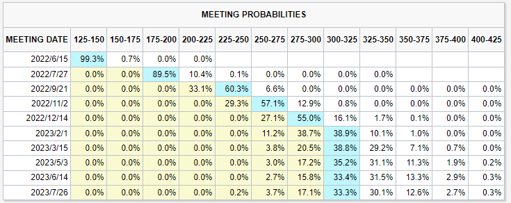 根据芝商所的“美联储观察工具”,该行在6月15日会议上加息50个基点至1.25%-1.50%区间的概率为99.3%;在7月27日会议上加息至1.75%-2%区间的概率为89.5%;在9月21日会议上加息至2%-2.25%区间的概率为60.3%。