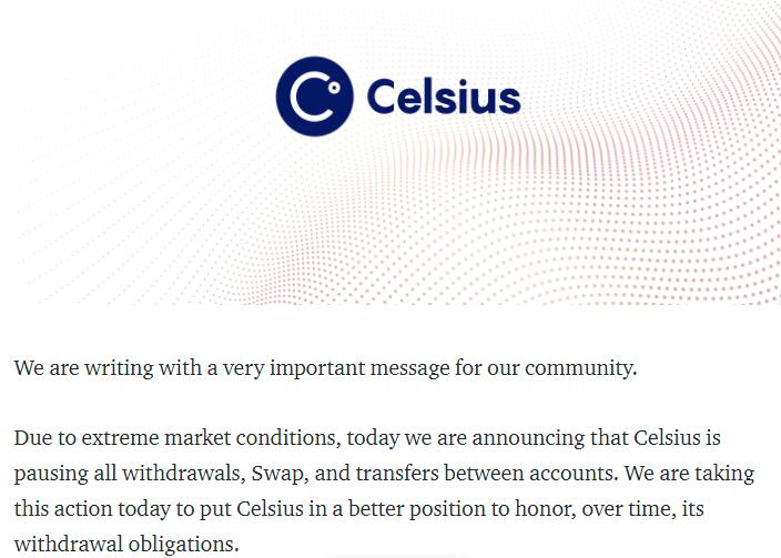 Celsius在官网公告中称,“为了我们整个社区的利益,我们正在采取这一必要的行动,以稳定流动性和业务,同时采取措施保存和保护资产。”