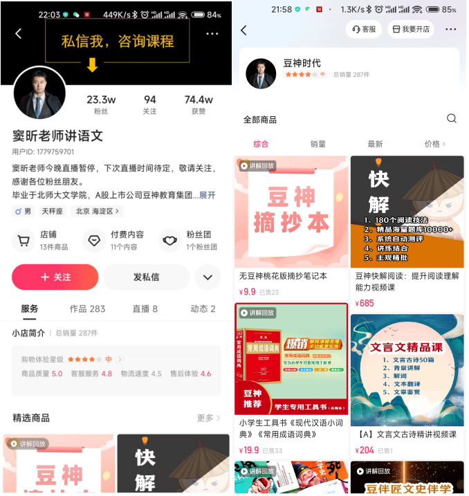 同时,上述窦昕个人账号的快手小店豆神时代总销售量不过287件,即便加上“大语文文学素养”的894件销售额,无论如何计算,都无法达到5000万元的GMV。同时,其在公告中称,截至本回函日,自营店铺销售额占总销售额的比例为98%。因此,在抖音5个直播账户,大多数停播,半年GMV将将过亿的前提下,豆神教育在快手,无论如何都无法凭借50万粉丝的两个账户,创造出半年5000万的销售额。
