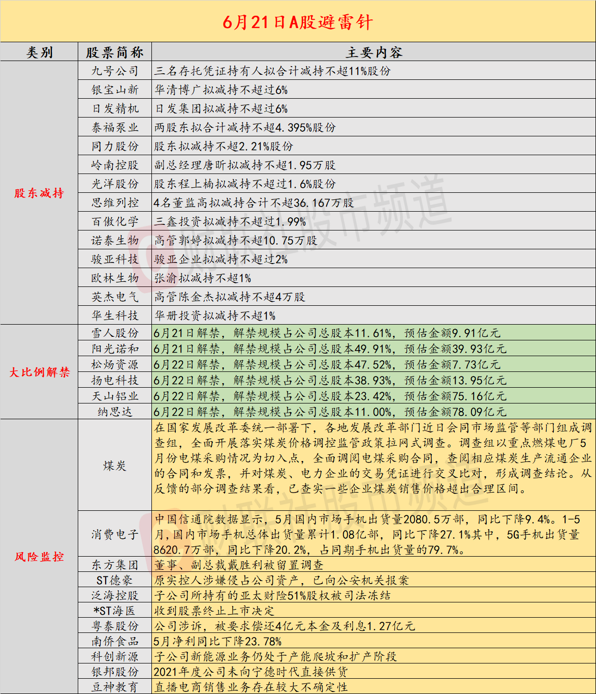 导读:财联社6月21日投资避雷针,近日,A股及海外市场潜在风险事件如下。国内经济信息方面包括:1)发改委部署各地开展拉网式调查煤炭价格超出合理区间的行为;2)5月国内市场手机出货量2080.5万部,同比下降9.4%;公司方面重点关注包括:1)东方集团董事、副总裁戴胜利被留置调查;2)九号公司三名存托凭证持有人拟合计减持不超11%股份;海外市场重点关注包括:1)多国警告新一轮奥密克戎BA.4/BA.5疫情来势汹汹,重复感染风险显著;2)腾讯“清仓式”减持新东方在线,净赚近3亿港元。