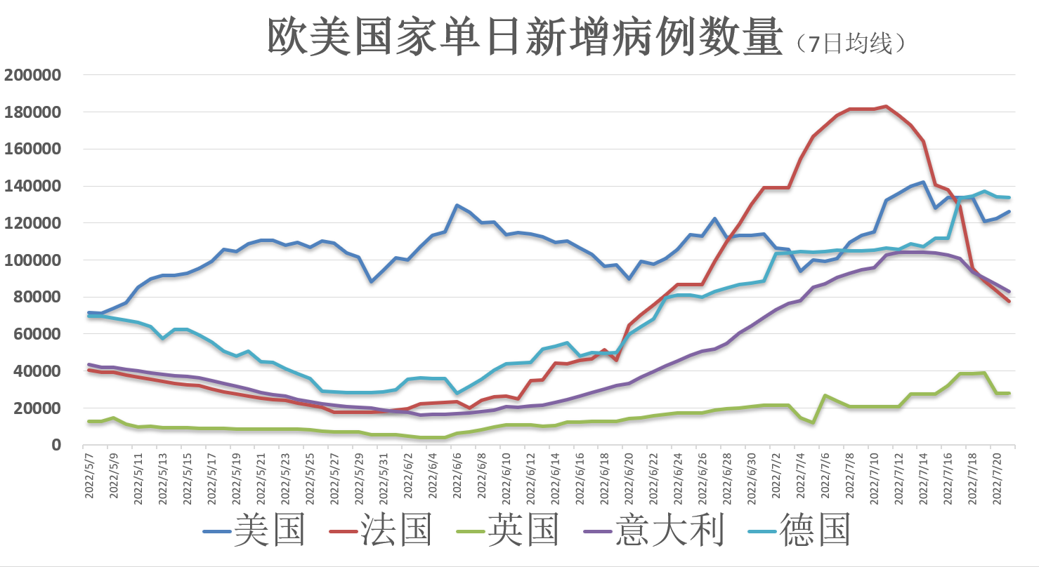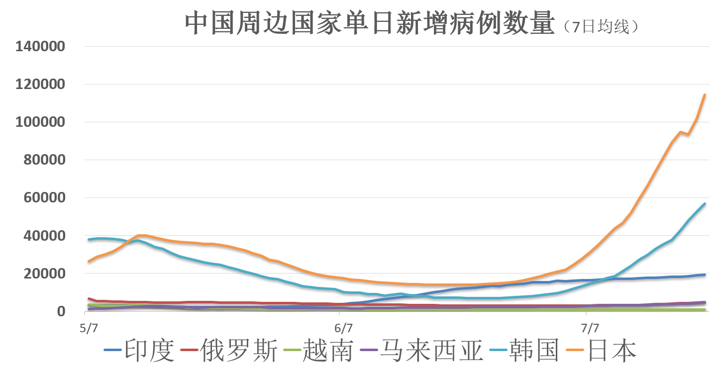 此外,亚洲疫情继续处于摇摆状态,BA.4/5病毒造成的破坏正在持续增加。中国周边的日本近一个月的新增确诊数据达到160万人,单日新增病例数亦维持在历史高位。