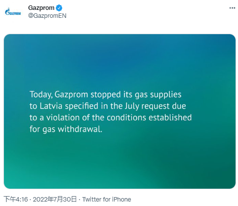 财联社7月30日讯(编辑 史正丞)当地时间周六,俄罗斯天然气工业股份公司(Gazprom)发布公告称已经停止向邻国拉脱维亚供应7月合同框架的天然气,理由是后者违反了合同。
