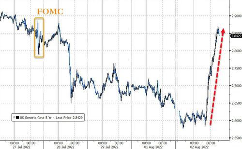 周二波动最大的是5年期美债收益率——全天大幅飙升了22个基点至2.861%,这是2020年3月17日以来该期限收益率最大的单日涨幅,同时也抹去了上周美联储决议后的所有跌幅。