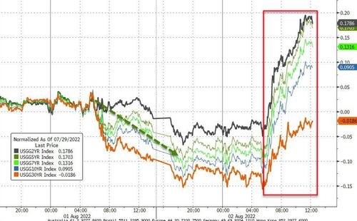 行情数据显示,美债隔夜遭遇全面抛售,各期限收益率的基点涨幅普遍达到了两位数。截止当天尾盘,2年期美债收益率上涨17.9个基点报3.061%,为6月中旬以来最大单日涨幅。基准10年期美债收益率上涨17.3个基点报2.753%,30年期美债收益率上涨9.4个基点报3.011%。