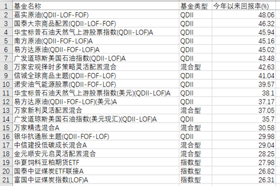 据济安金信基金评价中心最新统计数据,截至7月底,股票型基金TOP20均取得正收益;混合型基金TOP20均取得超过10%的收益率;QDII中,业绩TOP10里有9只是原油类QDII,业绩最好基金今年以来回报率高达48.06%。