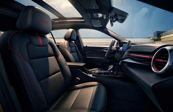 来到车内,Seeker的时尚科技气息扑面而来。全新内饰设计语言搭配极富创意的设计组合,让人明显感受到雪佛兰内饰好起来了!以驾驶员为中心的新一代运动数字科技座舱,配合高品质内饰材料,更具高感知价值。悬浮式双10.25吋渐层智慧屏向驾驶员侧倾斜约9度,让驾驶者更专注。同时,RS 系列专属设计的应用令座舱更具运动激情,D型真皮平底方向盘配备曜黑领结、兼具运动感与活力的炮筒式出风口镶嵌耀红镭雕状饰条、亚克力水晶质感排挡杆配RS专属耀红徽标与高亮饰板装饰、RS专属徽标运动座椅及遍布座椅、扶手及门板的耀红缝线,无不彰显雪佛兰品牌与生俱来的赛道基因与运动精神。