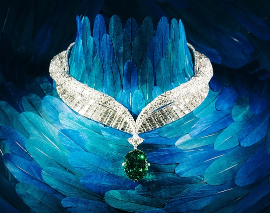 “GRACE优雅”主题中,力量感与优雅气质的恰当平衡,筑就了令人动容的羽翼项链,宛如凤凰的双翼在颈间徐徐展开。项链整体呈现双层V字造型,一层V字形由定制切割长方形钻石构成,另一层则由镶嵌圆形钻石的弧形白金打造而成。曲线柔美的项链之上,一颗来自东非的沙弗莱石重达65.26克拉。宝石镶嵌在可拆卸吊坠上。为了搭配这条耗时两千余个小时制作的杰作,路易威登另打造了两套珠宝,包括造型优雅的颈链、戒指、耳环和手链。
