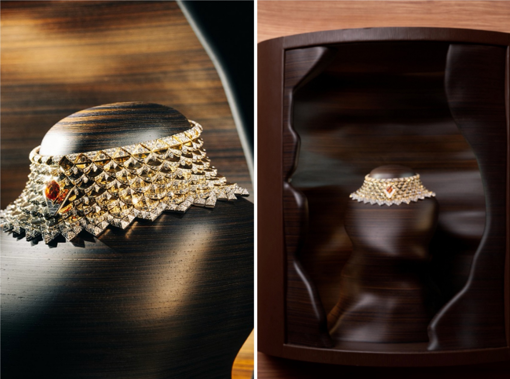 形似甲胄的华美项链,守护路易威登女性勇往直前,成就“RADIANCE闪耀”主题。项链的每个部件呈独立设计,令棋盘格图案巧妙贴合肌肤。金字塔构造令每块经镜面抛光的黄金饰件散发耀眼光泽,顶端钻石熠熠生辉。项链中央为一颗重达10.99克拉橘榴石,闪耀橙色光芒。配套袖口形手镯、吊坠和耳环同样呈现璀璨光芒,两枚配套戒指各饰有一枚橘榴石。