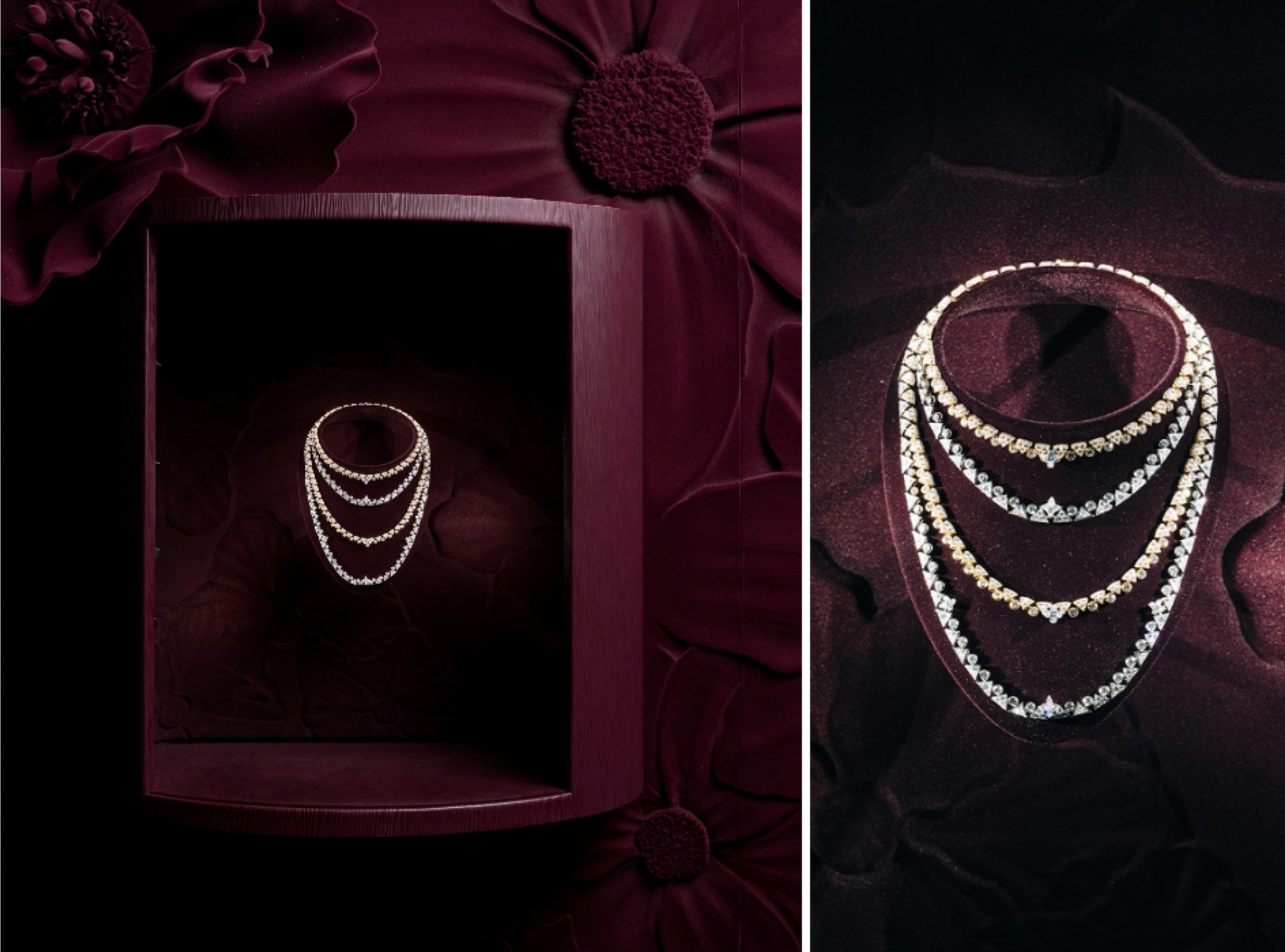 以黄金和白金勾勒的V字形和钻石密镶的三角形以精湛方式紧密交织,将路易威登始终推崇的旅行精神展现得淋漓尽致。“FANTASY梦幻”主题中,双色调的碰撞和质感的强烈对比造就了一款双层项链。纯净无暇的几何图形凸显V字形元素,呼应路易威登高级珠宝系列中呈现的箭头图案。这条项链提供三种不同佩戴方式,中央是一颗Monogram花型切割钻石。配套的迷人戒指通体饰有黄金V字图案,搭配圆形钻石,长项链、耳环、戒指和袖口手链采用同款设计。