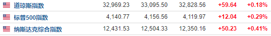 截至收盘,道指涨59.64点,涨幅为0.18%,报32969.23点;纳指涨50.23点,涨幅为0.41%,报12431.53点;标普500指数涨12.04点,涨幅为0.29%,报4140.77点。