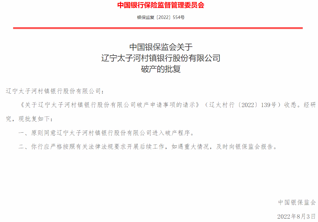 中国银保监会关于辽宁太子河村镇银行股份有限公司破产的批复