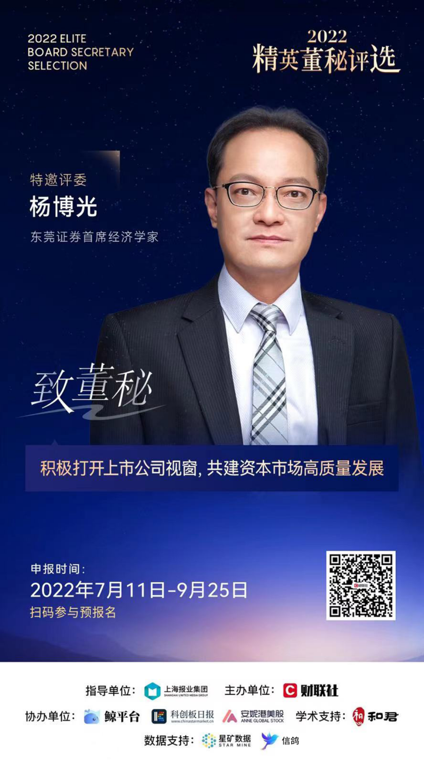本期将为您介绍2022精英董秘评选的特邀评委嘉宾,东莞证券首席经济学家,杨博光。
