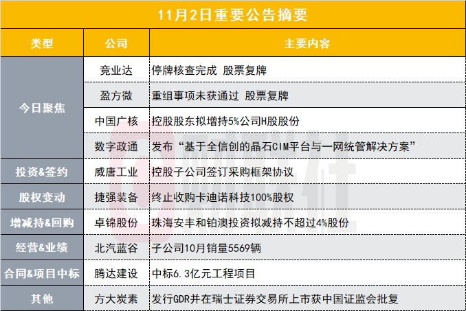 盈方微公告,公司发行股份购买资产并募集配套资金暨关联交易事项未获得中国证监会并购重组委员会审核通过,公司股票自11月3日开市起复牌。