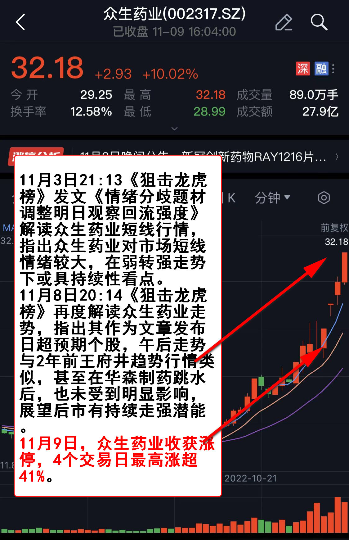 11月8日20:14《狙击龙虎榜》 发文再度 解读众生药业走势,指出其作为文章发布日超预期个股,午后走势与2年前王府井趋势行情类似,甚至在华森制药跳水后,也未受到明显影响,展望后市有持续走强潜能。