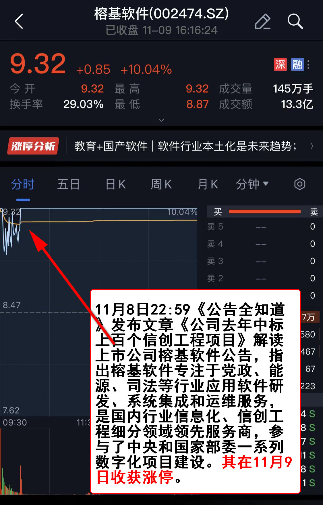 11月8日22:59《公告全知道》发布文章《 公司去年中标上百个信创工程项目 》解读上市公司榕基软件公告,指出榕基软件专注于党政、能源、司法等行业应用软件研发、系统集成和运维服务,是国内行业信息化、信创工程细分领域领先服务商,参与了中央和国家部委一系列数字化项目建设。其在11月9日收获涨停。