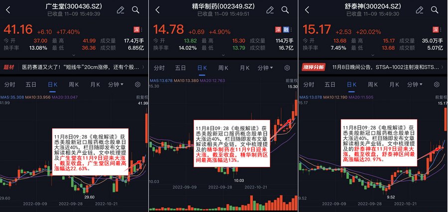 11月8日09:28《电报解读》获悉美股新冠口服药概念股单日大涨近40%, 栏目随即发布文章 解读相关产业链,据券商分析师观点“新冠肺炎疫情仍然呈现反复和不确定性较大的特点,新冠治疗产业链,尤其是小分子口服药产业链需求持续验证”。文中梳理提及广生堂、舒泰神、精华制药三家上市公司,均在11月9日迎来大涨,截至收盘,广生堂区间最高涨幅达22.63%,舒泰神区间最高涨幅达20.97%,精华制药区间最高涨幅达13%。