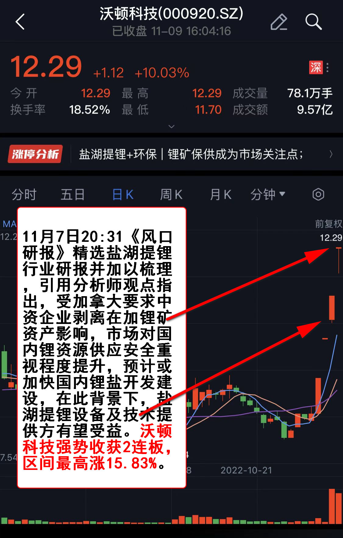 11月7日20:31《风口研报》精选盐湖提锂行业研报并加以梳理, 引用分析师观点指出 ,受加拿大要求中资企业剥离在加锂矿资产影响,市场对国内锂资源供应安全重视程度提升,预计或加快国内锂盐开发建设,在此背景下,盐湖提锂设备及技术提供方有望受益。沃顿科技强势收获2连板,区间最高涨15.83%。