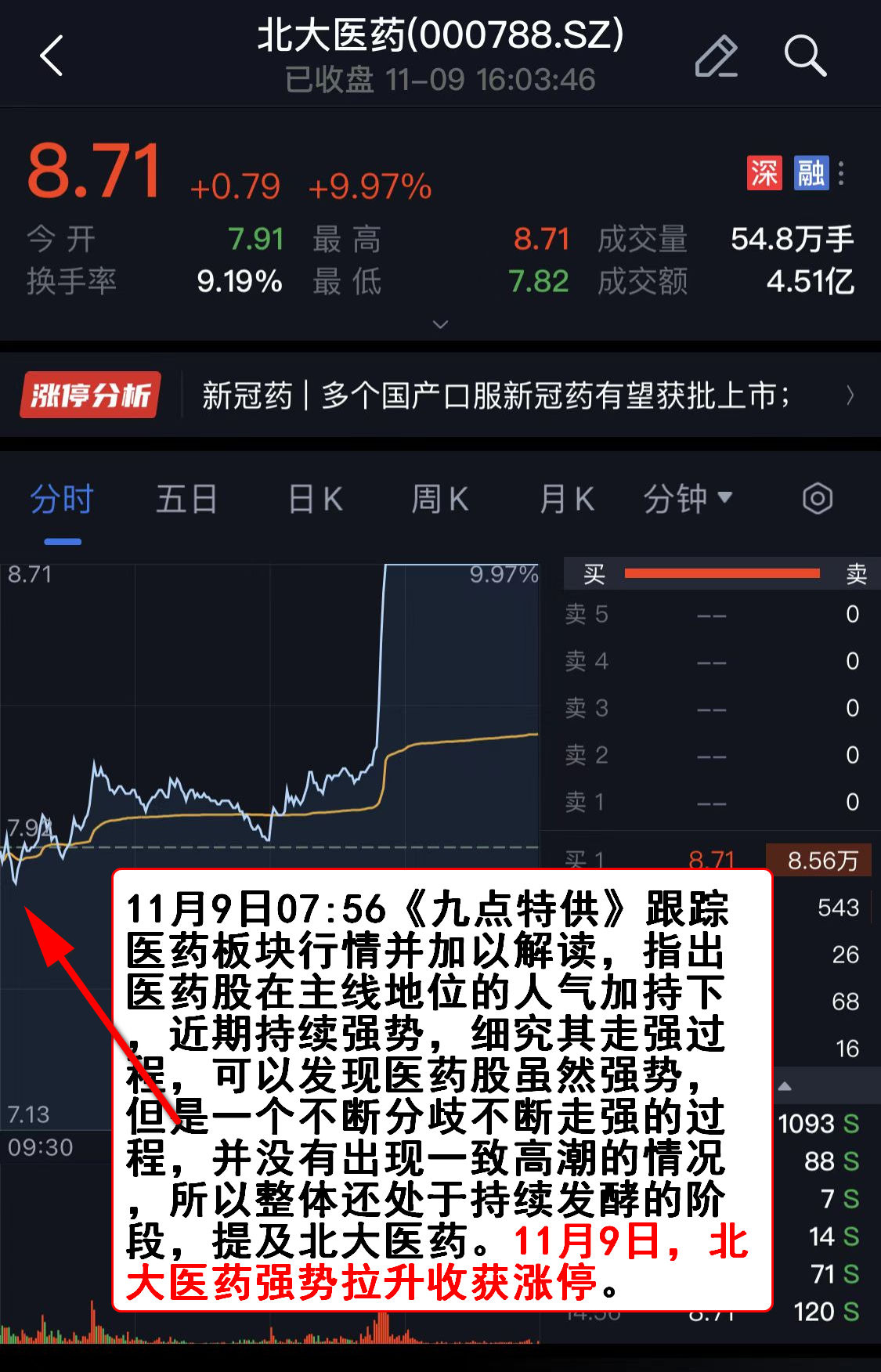 11月9日07:56《九点特供》跟踪医药板块行情并加以解读, 发文指出 医药股在主线地位的人气加持下,近期持续强势,细究其走强过程,可以发现医药股虽然强势,但是一个不断分歧不断走强的过程,并没有出现一致高潮的情况,所以整体还处于持续发酵的阶段,提及北大医药。11月9日,北大医药强势拉升收获涨停。