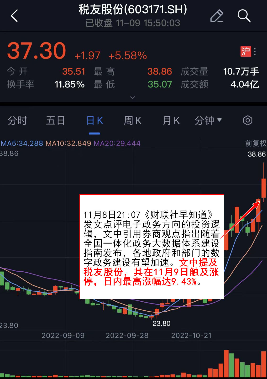 11月8日21:07 《财联社早知道》 发文点评 电子政务方向的投资逻辑,文中引用券商观点指出随着全国一体化政务大数据体系建设指南发布,各地政府和部门的数字政务建设有望加速。文中提及税友股份,其在11月9日触及涨停,日内最高涨幅达9.43%。
