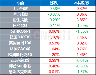 美东时间周五,美股主要指数收盘小幅上涨,道指涨0.59%,本周累计下跌0.01%;纳指涨0.01%,本周累计下跌1.57%;标普500指数涨0.48%,本周累计下跌0.69%。公用事业、风电板块涨幅居前,公务集团、太平洋煤电涨超3%,美国水务涨超2%。热门科技股涨跌不一,思科涨超2%,苹果、Meta Platforms涨幅不足1%,特斯拉、英伟达跌超1%。石油煤气、社交媒体板块跌幅居前,新泽西能源、Liquid Media跌超5%,Snap跌超3%,美国能源跌超2%。