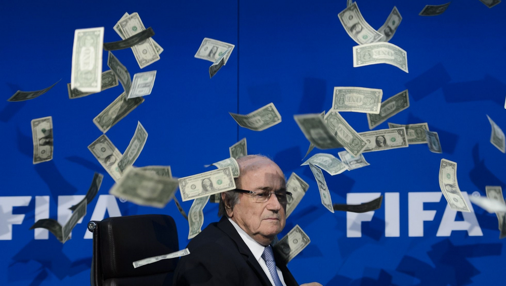 (布拉特在国际足联发布会上遭“撒钱”,来源:社交媒体)