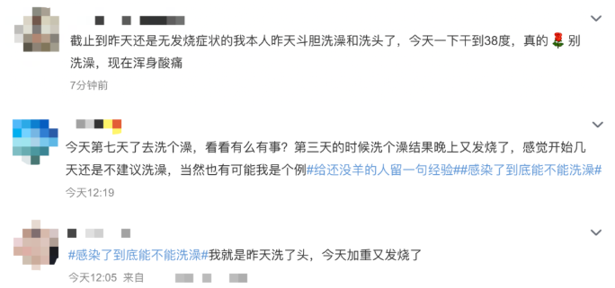 有的网友以“亲身经历”力劝他人:“千万别洗!我洗完又发烧了!”“洗完澡症状反而加重了”,“发烧期间洗澡简直‘要命’”。