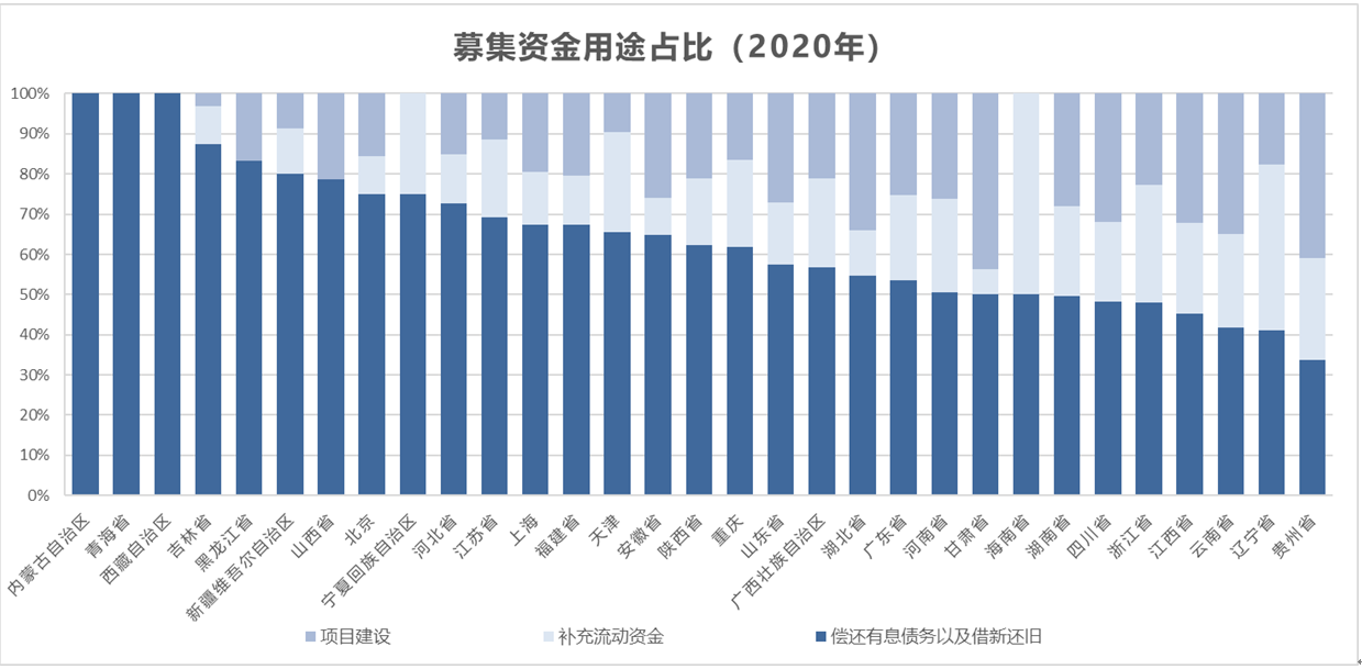 分省份的发行资金用途情况分析。从债券发行的募集用途来看,近期新发债券中偿债和“借新还旧”的比重进一步加大。2021年以来,城投债发行的募集资金主要为偿债和借新还旧,受大部分地方政府债务压力上升和监管部门“红橙黄绿”分级发行指引的影响,城投债务滚动需求增加,新发债券用于补流和项目建设的比重明显下降。