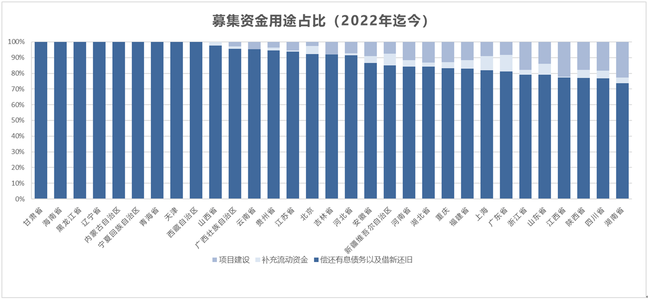 从整体趋势来看,我们可以看到2020年-2022年整体的募集资金用途中偿还有息债务以及借新偿旧的比率逐年递增。而分地区来看,2022年迄今,甘肃省、海南省、黑龙江省、辽宁省、内蒙古、宁夏、青海、天津以及西藏用于偿债和“借新还旧”的比重达到100%。
