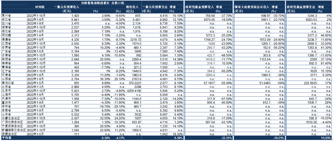 税收逐渐回暖,但政府性基金收入仍然低迷:从全国范围来看,1-11月累计,全国一般公共预算收入185518亿元,扣除留抵退税因素后增长6.1%,按自然口径计算下降3%,全国一般公共预算支出227255亿元,比上年同期增长6.2%。2022年1-11月累计,全国政府性基金收入6万亿元,同比下降21.5%,全国政府性基金支出9.6万亿元,同比增长5.5%。1月政府性基金收入累计同比增速为-21.5%(-22.7%),改善幅度有限。支出累计同比增速5.5%(9.8%),而预算增速为5.9%。从地区的经济财政情况来看,根据最新的各地财政数据,我们可以看到统计范围的省级2022年年初以来的一般公共预算收入按自然口径平均下滑4.17%,而一般公共预算支出同比增加6.58%。由于国有土地使用权出让收入的下行带来收入中政府性基金收入同比大幅下降33.51%。而政府性基金支出同比增幅为15.65%。