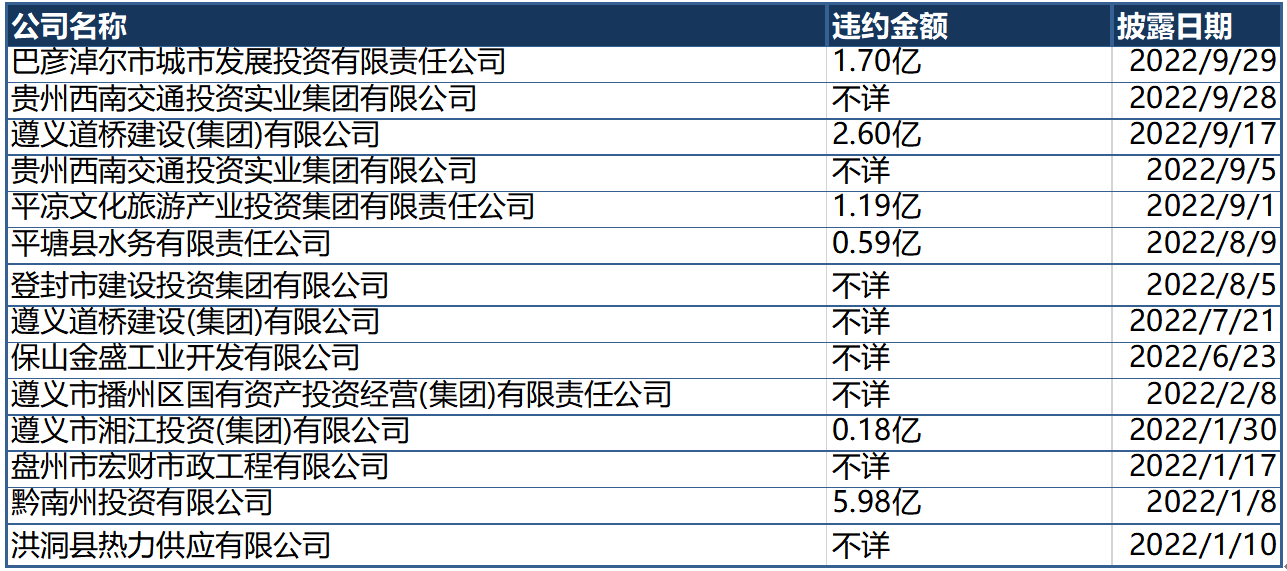 非标违约。2022年以来,非标违约主要集中在经济财政实力较弱或债务率较高的区域,分省份来看,贵州所涉及非标违约数量较大,披露违约数量分别为8个,占不完全统计的非标违约的比重高达57%。分行政级别来看,地市级违约规模和数量较多;省级违约事件较少且规模较小。