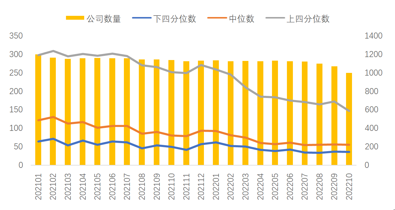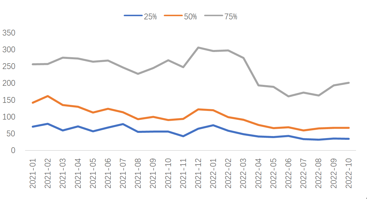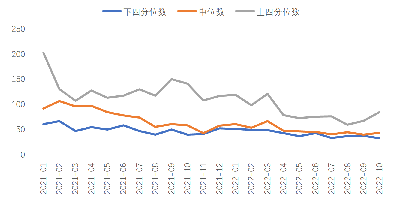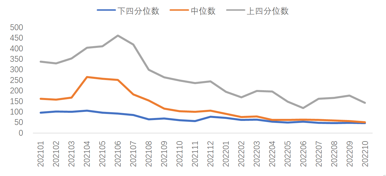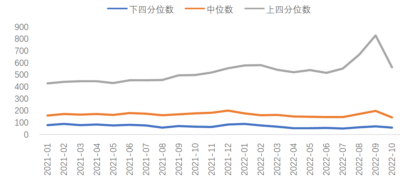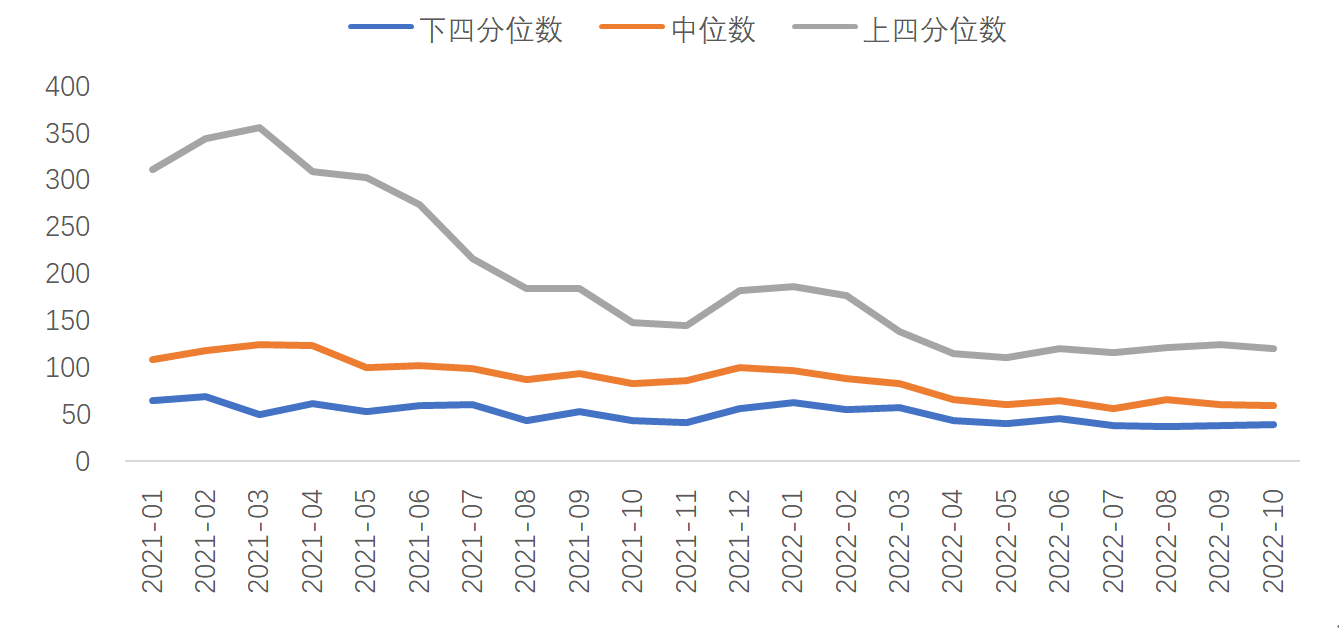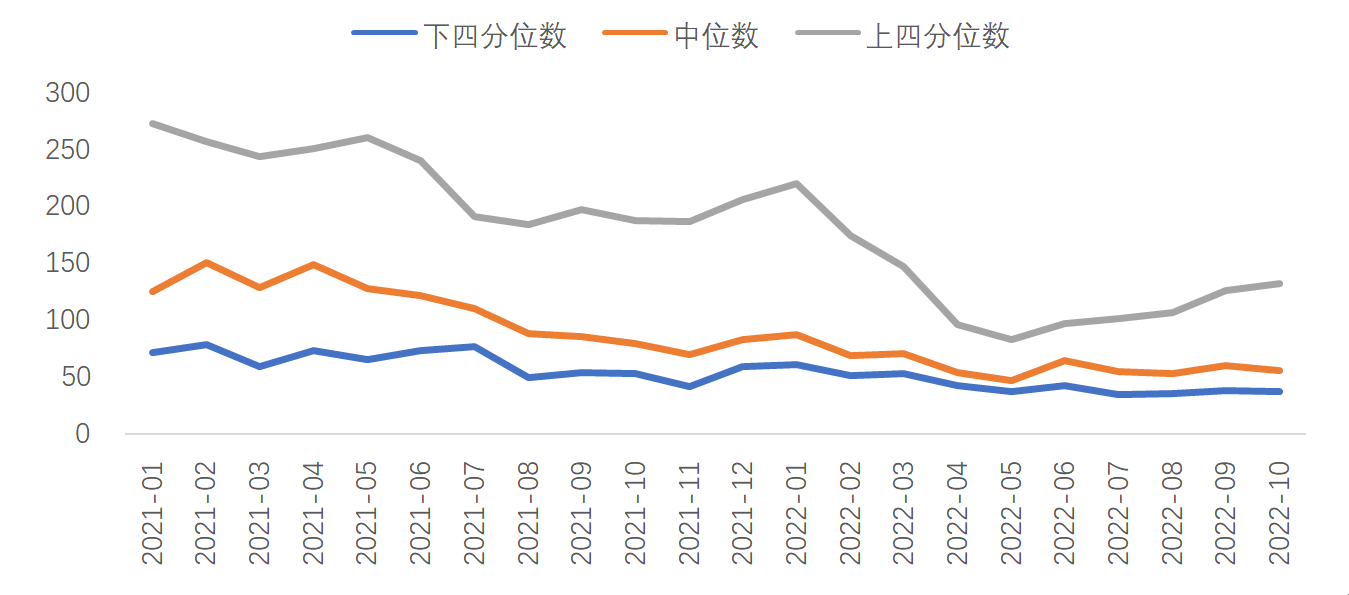2021年以来,债券市场成交活跃债券的主体数量呈现下降态势,利差逐步走低。2022年10月市场交易较为活跃的发债主体共997个,较上年同期下降12.31%,主要原因是高信用风险主体发债减少所致。高风险主体减少以及带来的可交易债券数量下将等因素使市场利差呈现下降趋势。2022年10月,利差中位数为55.09个基点,较上年同期下降25.07个基点,降幅为31.28%;利差上四分位数为146.89个基点,较上年同期下降104.61个基点,降幅为41.59%;利差下四分位数为36.27个基点,较上年同期下降13.52个基点,降幅27.16%,利差下降明显。