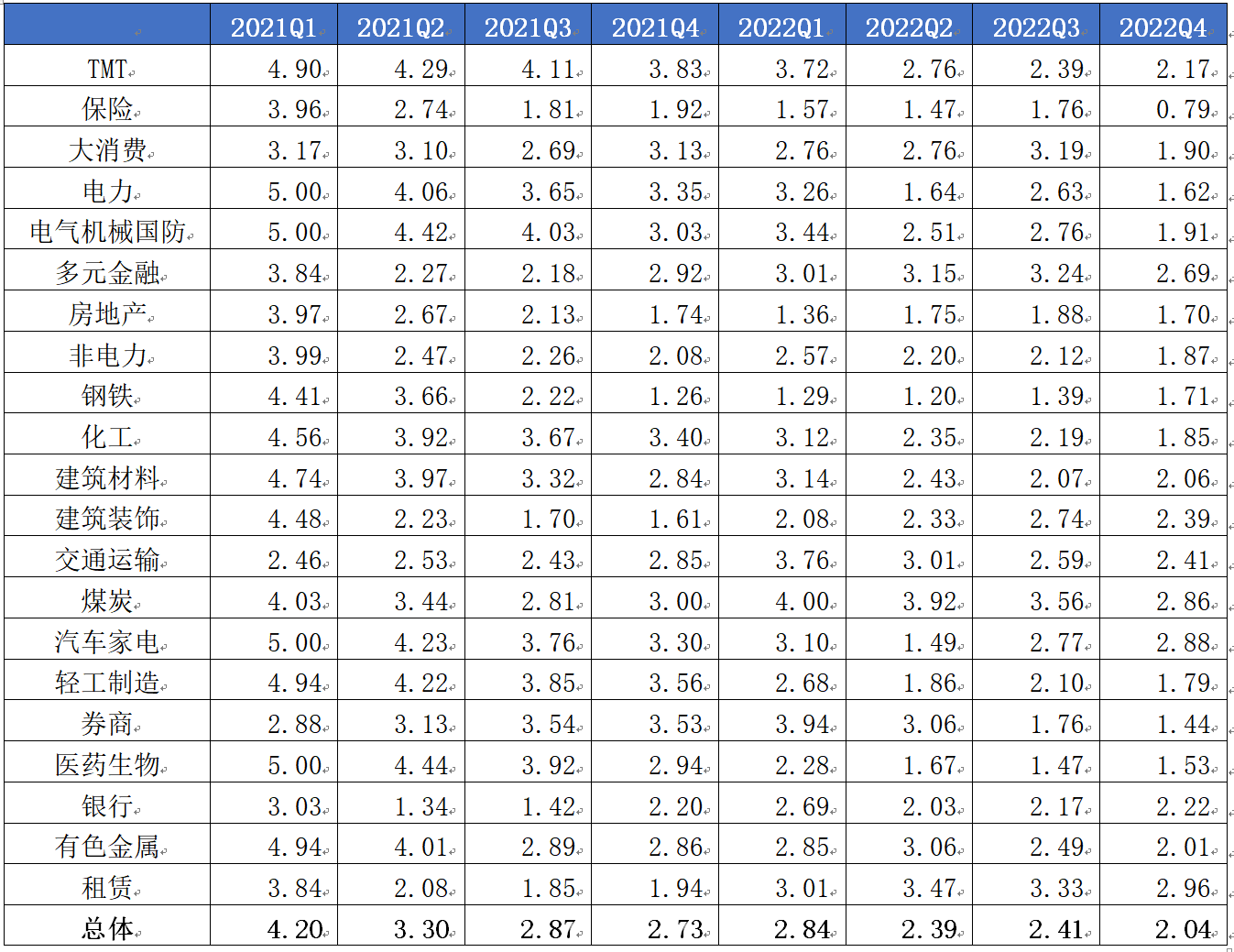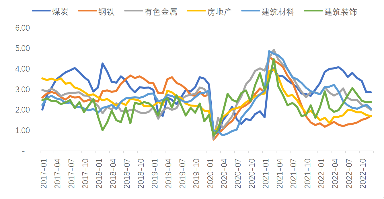 建筑材料和建筑装饰行业与房地产行业的关联度较高,受地产行业不景气影响,建筑材料和建筑装饰行业的景气度均表现不佳。截止2022年末,建筑材料行业和建筑装饰行业的景气度指标分别为2.06分和2.39分,表现相对比较一般。