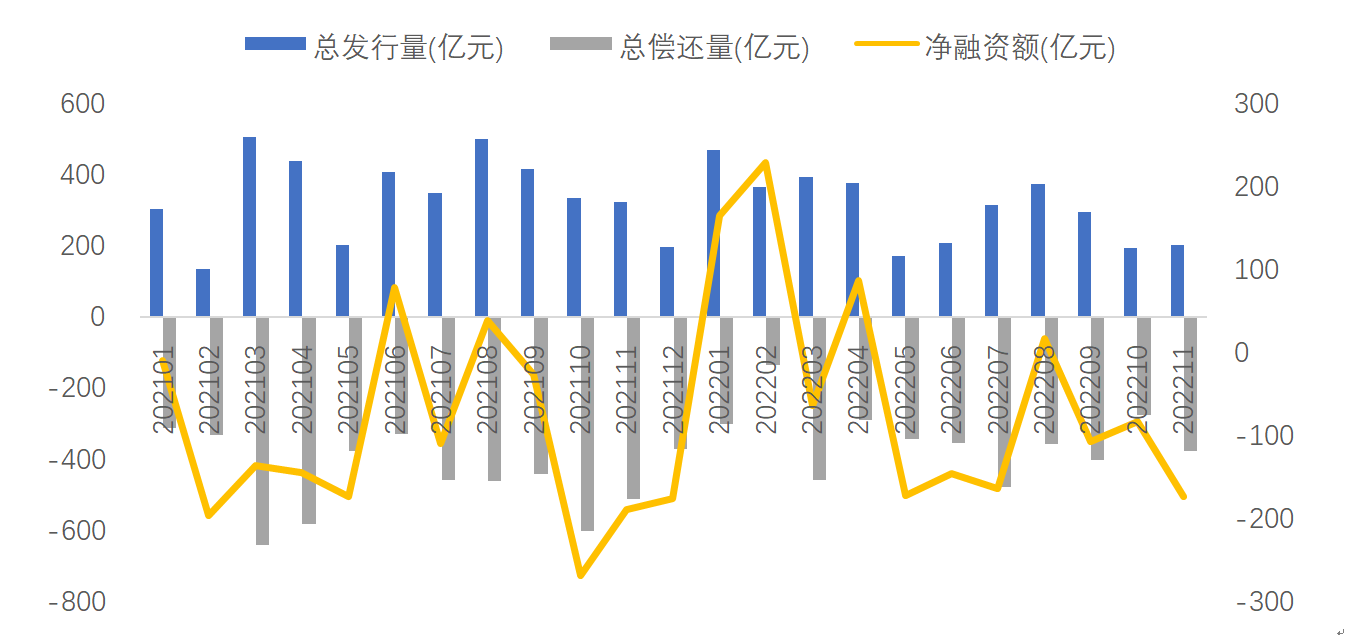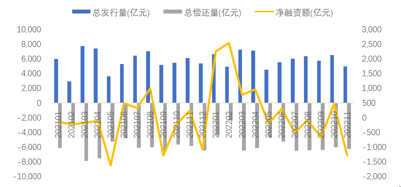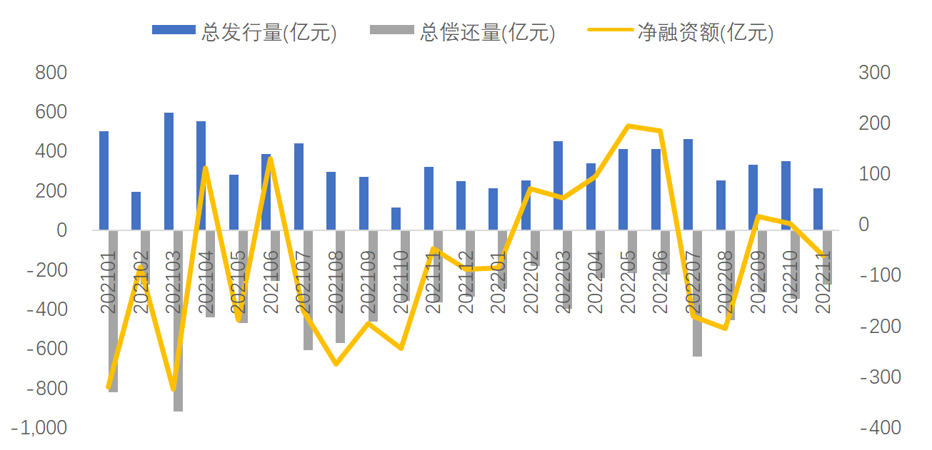 市场净融资方面,2022年1月-11月净融资额为4,632.88亿元,较上年同期的-1064.17亿元明显增加,主要是1月、2月债券到期偿付金额较少,净融资额较高导致。
