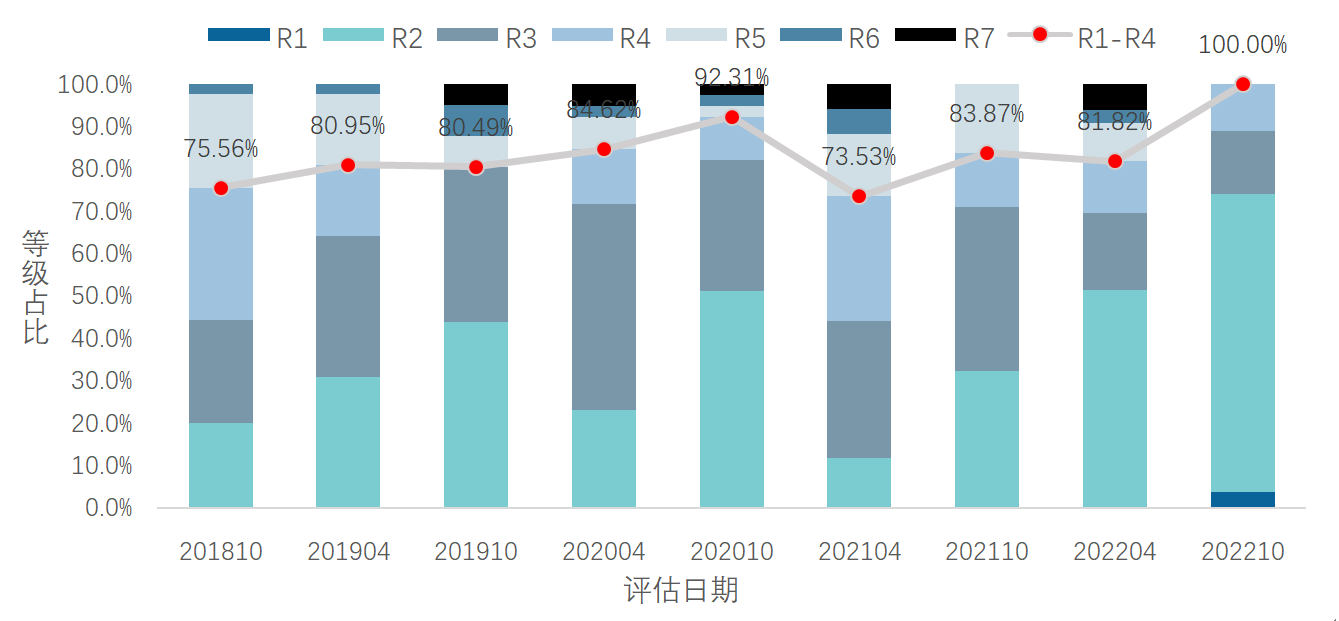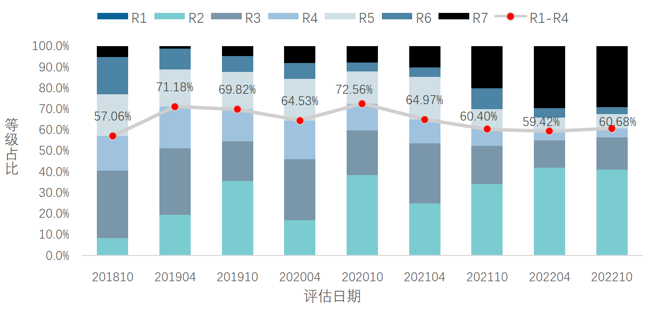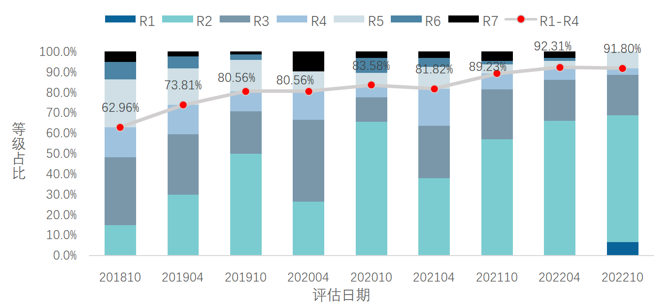 翰墨评估结果显示,建筑行业整体信用水平依旧比较稳健。主要表现为,可投资类企业占比高,截至2022年10月,“可投资类(R1-R4)”等级企业占比为95.51%,较上年同期增加8.24个百分点。
