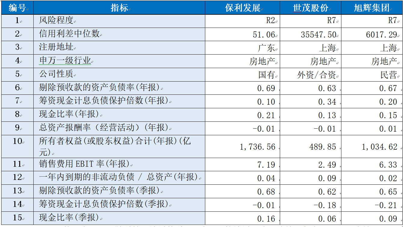 结合以上因素,保利发展的信用风险等级应为R2,而世茂股份和旭辉集团的信用风险等级应为R7。